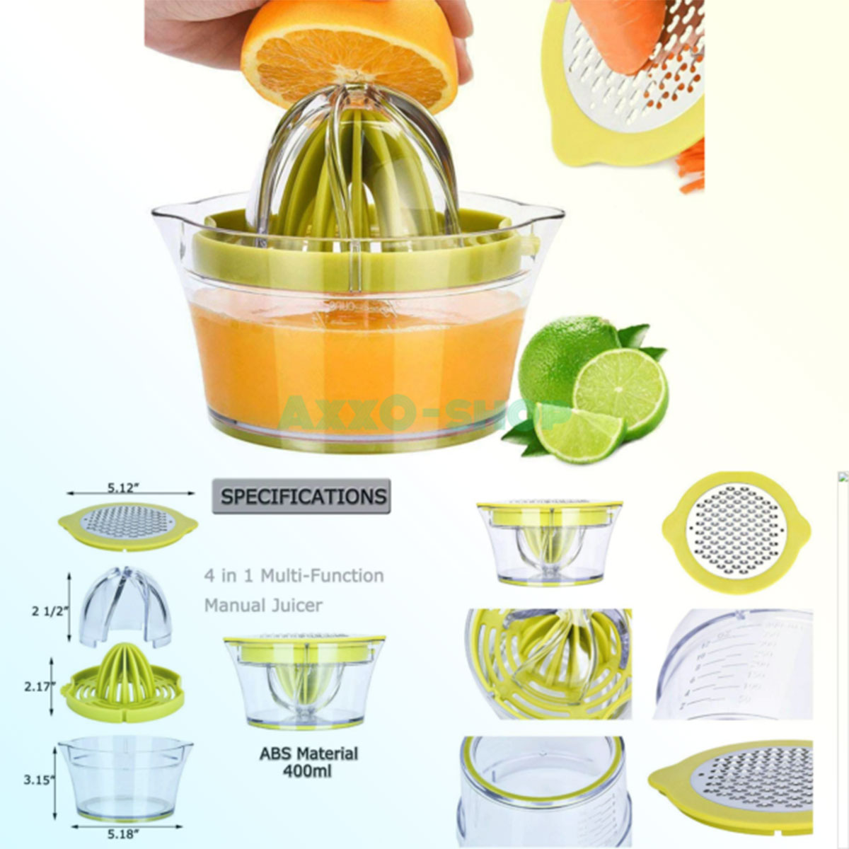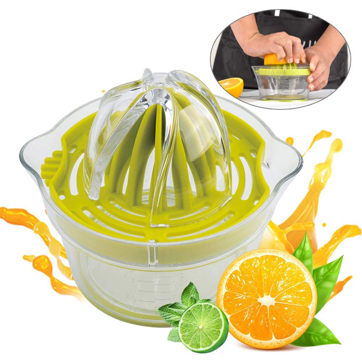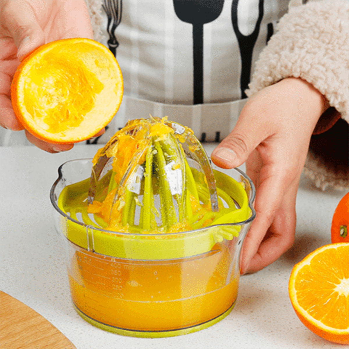 This manual juicer can easily filter out the seeds, heavy pulp and citrus peel from your juice to retain the most delicious juice. 400ml/12oz large capacity allows you to store about 5 oranges at a time, this manual juicer container is enough for home use.