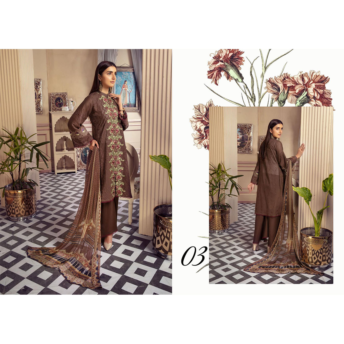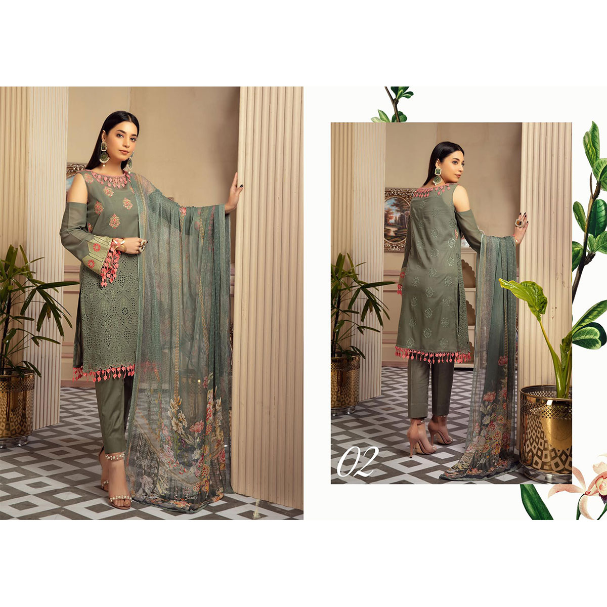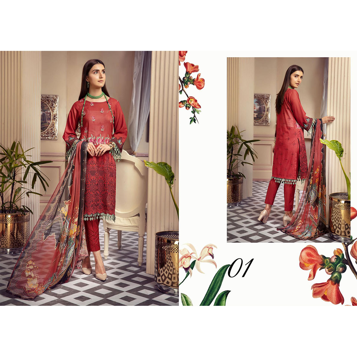 Blossom Embroidered Swiss Lawn With Printed Crinkle Dupatta By Riaz Arts – Per Set -10 Suit