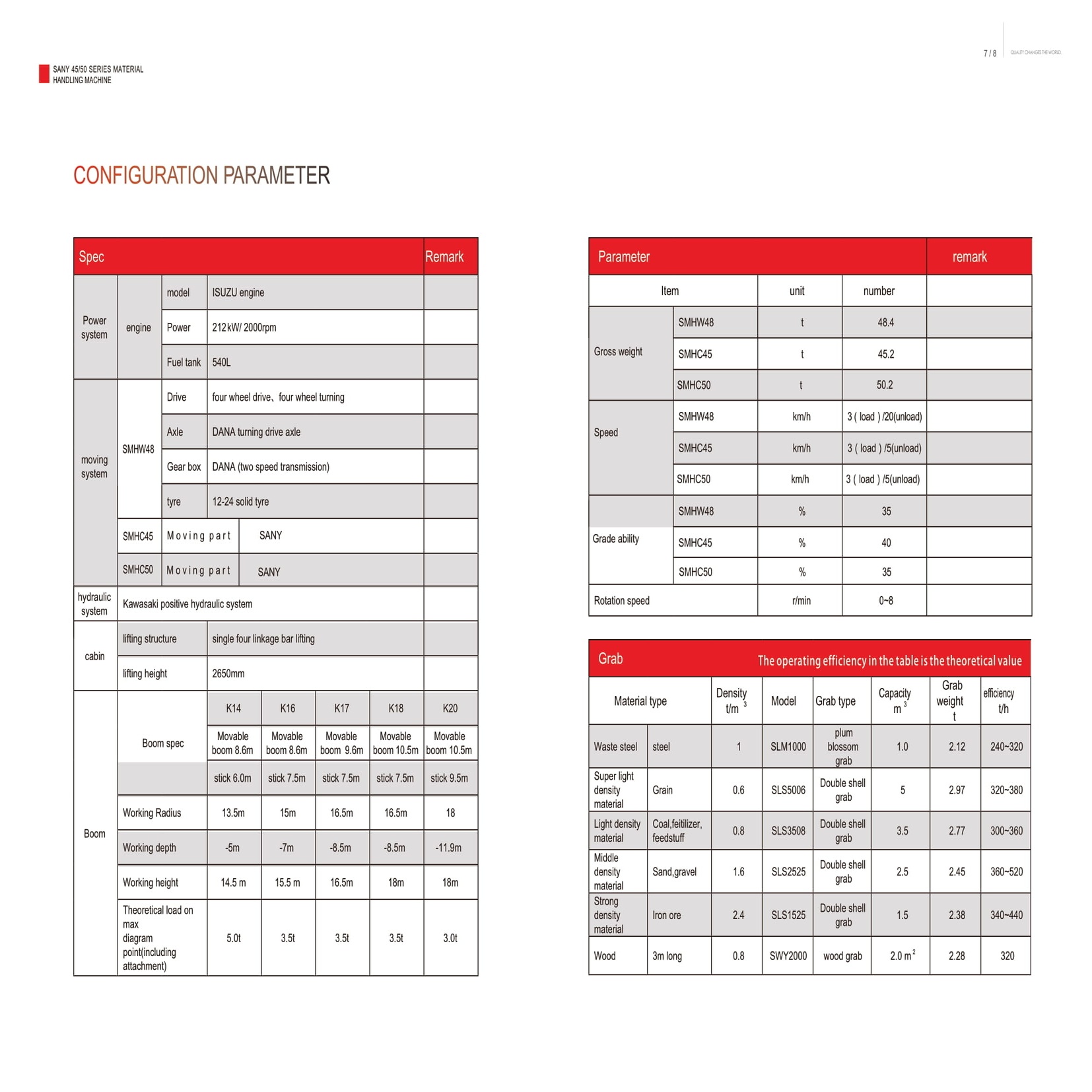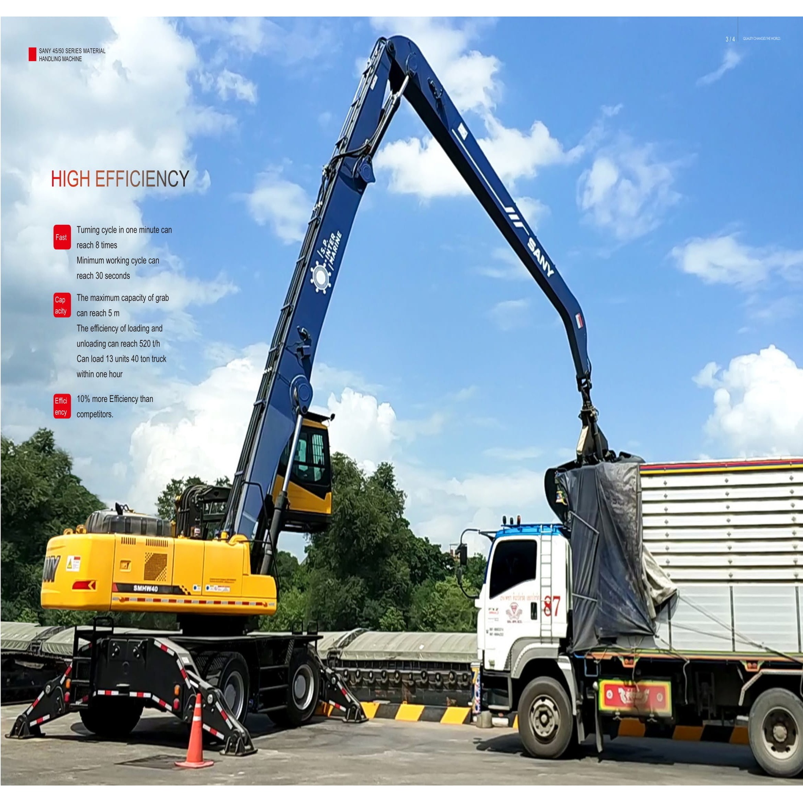 1. Fast: Turning cycle in one minute can reach 8 times .Minimum working cycle can reach 30 seconds 2. Capacity: The maximum capacity of grab can reach 5 m. The efficiency of loading and unloading can reach 520 t/h. Can load 13 units 40 ton truck within one hour 3. Efficiency: 10% more Efficiency than competitors.
