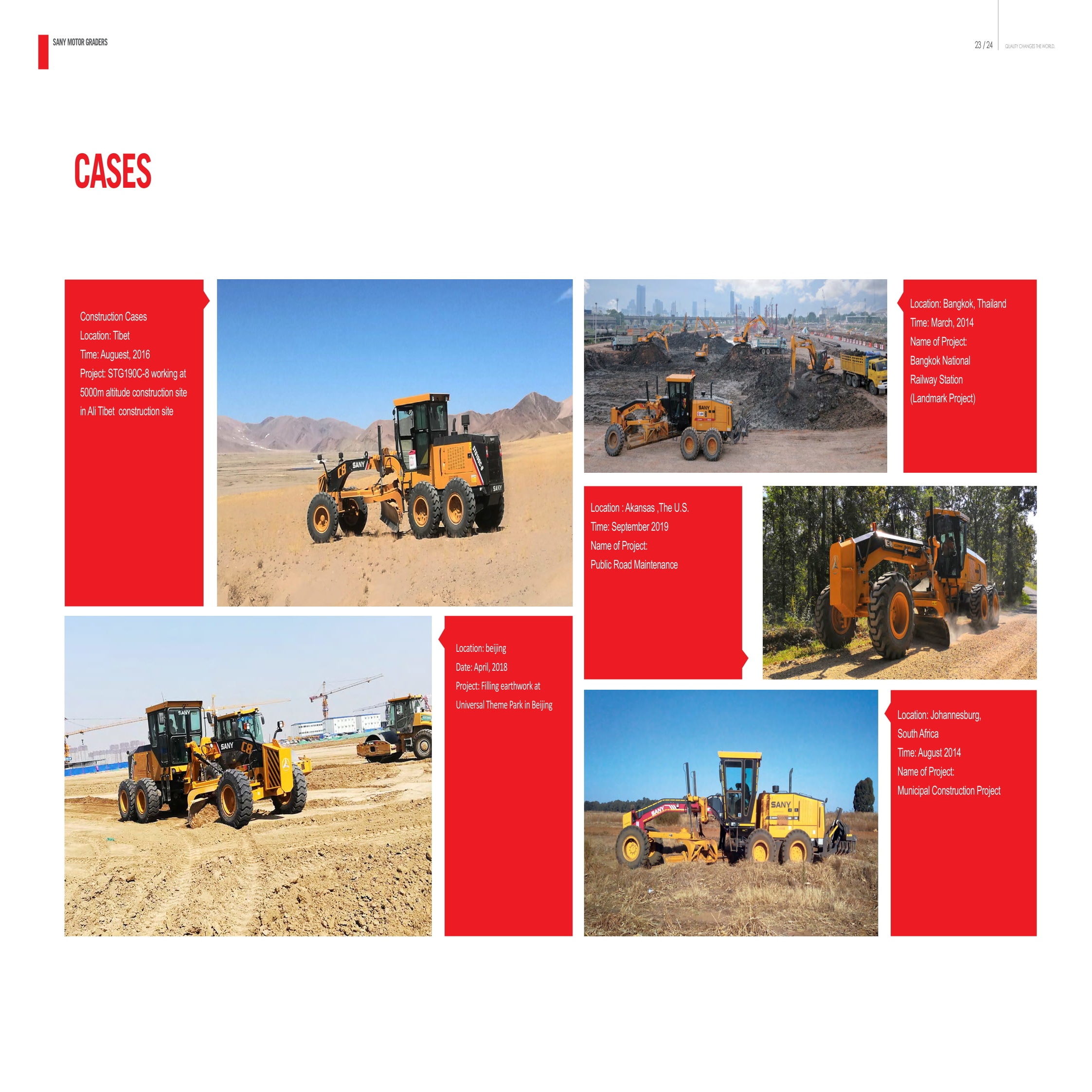 SANY motor grader features by ease of operation, strong power, reliable components and environment-friendly. SANY road graders adopts world's first hydraulic mechanical transmission system and intelligent control system, realizing precise hydraulic control and creating higher efficiency. The newly-designed structure and strengthened parts make the road grader easier to be maintained.