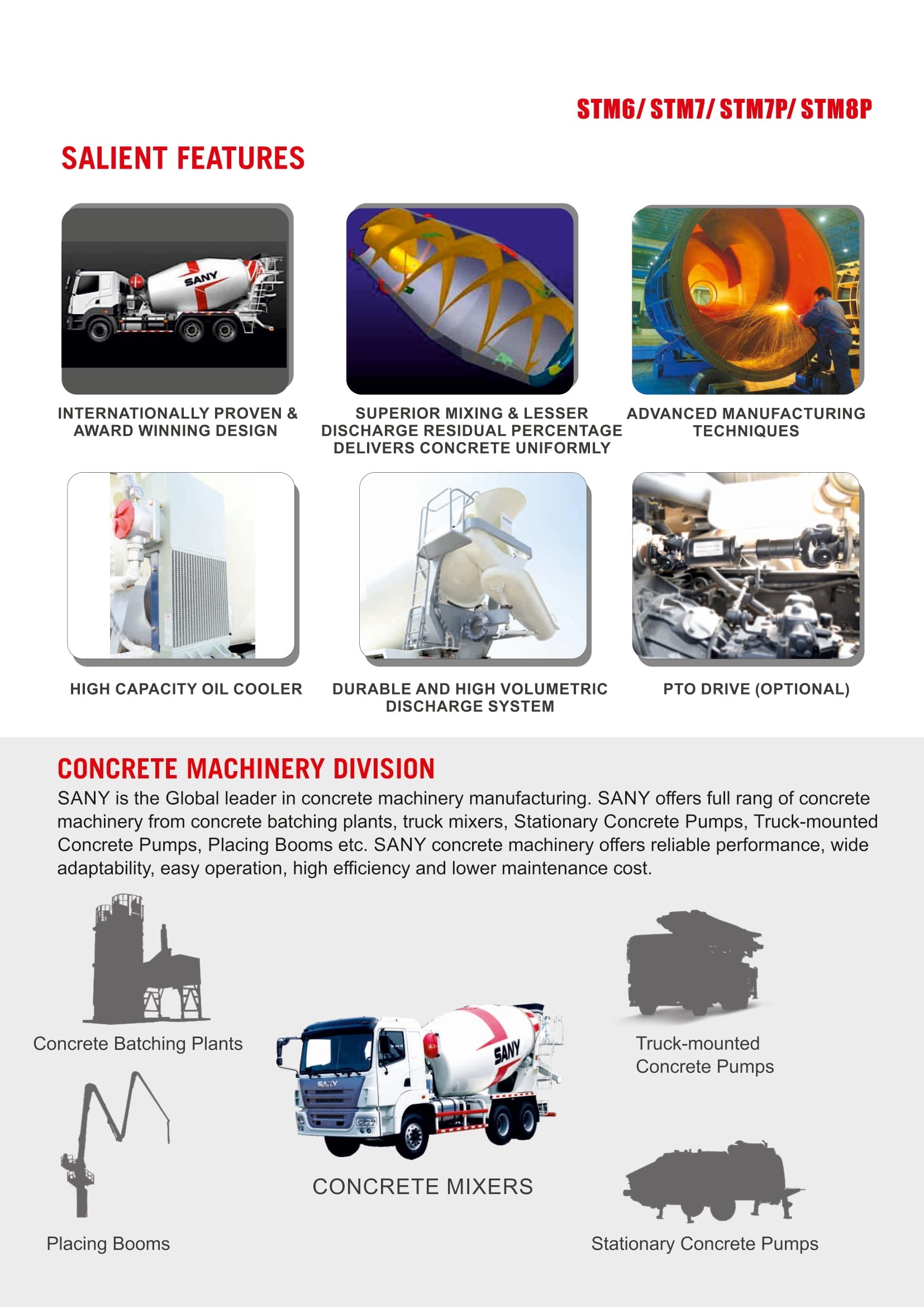 STM 7: Sany STM7 truck Mixer having normal capacity 7cbm, geometrical volume of 12.71. & fill ratio of 54.9 Sany Truck Mixer are highly durable& volumetric discharge system. The 7cbm truck mixer can adapt to varied harsh conditions and improves its service life.