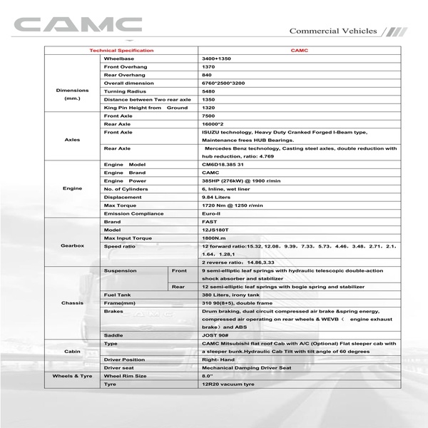 Cabin Type: CAMC Mitsubishi flat roof Cab with A/C (Optional) Flat sleeper cab with a sleeper bunk.Hydraulic Cab Tilt with the tilt angle of 60 degrees
