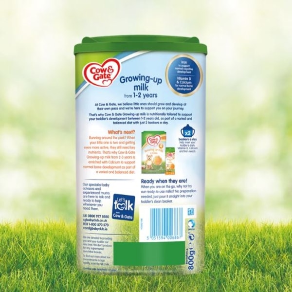 Skimmed milk, Lactose (from milk), Vegetable oils (Palm oil, Sunflower oil, Rapeseed oil), Whey product (Demineralised whey, Whey protein concentrate) (from milk), Maltodextrin, Galacto-oligosaccharides (GOS) (from milk), Potassium hydrogen phosphate, Calcium phosphate, Fructo-oligosaccharides (FOS), Calcium carbonate, Magnesium citrate, Vitamin C, Potassium citrate, Sodium chloride, Emulsifier (soy lecithin), Potassium chloride, Iron sulphate, Zinc sulphate, Vitamin D3, Vitamin E, Pantothenic acid, Vitamin B12, Folic acid, Niacin, Vitamin A, Riboflavin, Biotin, Vitamin B6, Thiamin, Potassium iodide, Vitamin K1.
