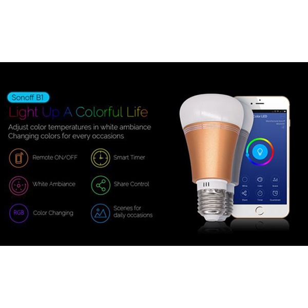 Sonoff B1 is a white and color ambiance dimmable LED bulb with an E27 screw base. The dimming led lamp can be dimmed or brighten via iOS/Android App. With the App, users can select White, then the light will become white ambiance, they can set color temperature from cold to warm and change the brightness from 1%-100%. If they select a color, they can change the color spectrum of the RGB bulbs to the favorite atmosphere. There are four available scenes for the dimming LED bulb: rest, reading, party, and casual. The Sonoff B1 E27 color LED bulb is compatible with Amazon Alexa(Amazon Echo, Echo Dot, Tap). Users can ask Alexa to dim or brighten or adjust the colors of the led light bulb.