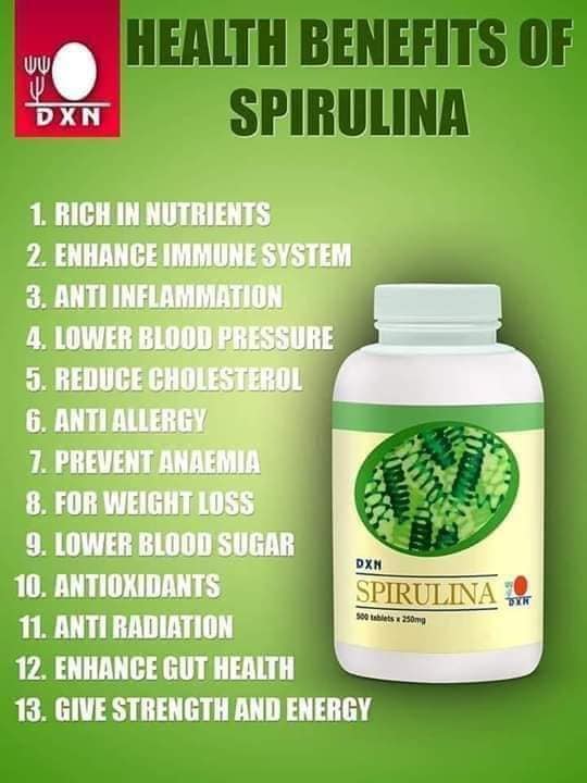 ★ স্পিরুলিনা নিয়মিত খেলে দৈনন্দিন পুষ্টি চাহিদা পূরণ করে পুষ্টিহীনতা, রক্তশূন্যতা, রাতকানা, ডায়াবেটিস, উচ্চ রক্তচাপ, আলসার, বাত, হেপাটাইটিস ও ক্লান্তি দূর হবে।