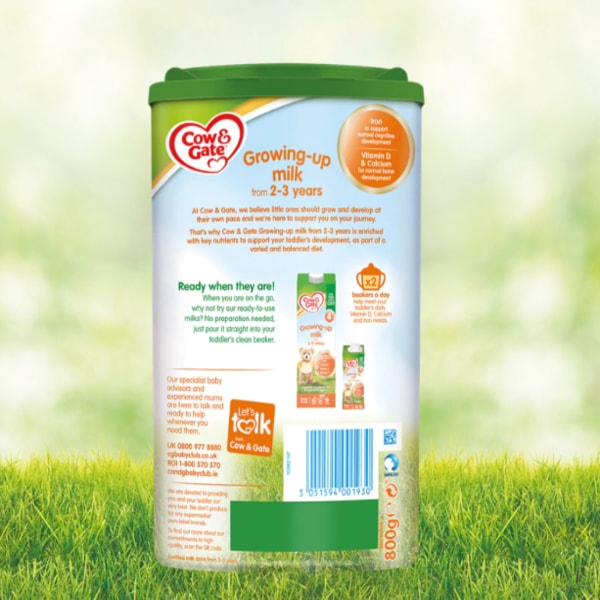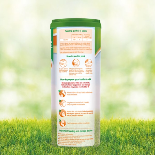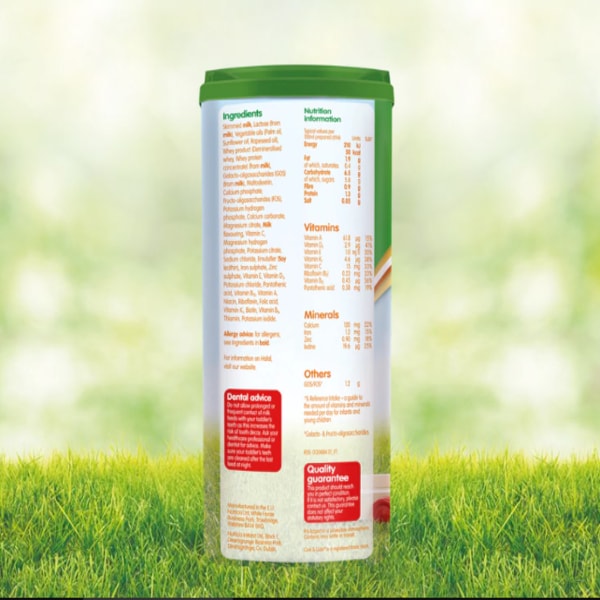 Skimmed milk, Lactose (from milk), Vegetable oils (Palm oil, Sunflower oil, Rapeseed oil), Whey product (Demineralised whey, Whey protein concentrate) (from milk), Galacto-oligosaccharides (GOS) (from milk), Maltodextrin, Calcium phosphate, Fructooligosaccharides (FOS), Potassium hydrogen phosphate, Calcium carbonate, Magnesium citrate, Milk flavouring, Vitamin C, Magnesium hydrogen phosphate, Potassium citrate, Sodium chloride, Emulsifier (soy lecithin), Iron sulphate, Zinc sulphate, Vitamin E, Vitamin D3, Potassium chloride, Pantothenic acid, Vitamin B12, Vitamin A, Niacin, Riboflavin, Folic acid, Vitamin K1, Biotin, Vitamin B6, Thiamin, Potassium iodide.