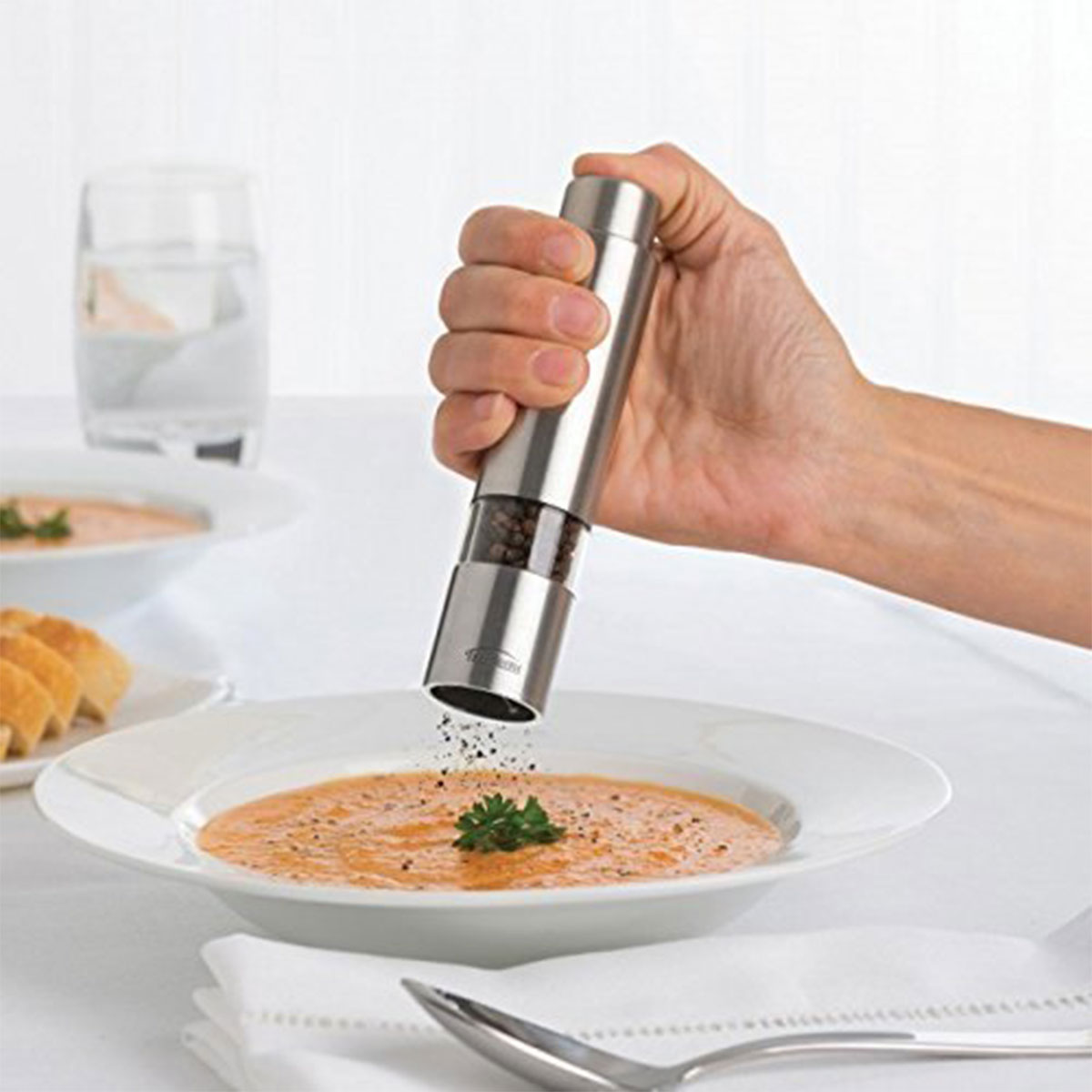 100% Brand new and high quality Innovative pepper mill dispenses spice with speed and ease Press the top to grind pepper in a simple, one-handed operation way Screw off the bottom for refilling Suitable for milling pepper, corn, mustard seed and other small sized spices Ideal gadget to make freshly ground pepper powder spice for enjoying a tasty salad or steak Size (H x Dia.): Approx. 6 x 1 inch / 15 x 2.7 cm Material: Stainless steel Color: Silvery Included: 1 x Pepper Grinder.