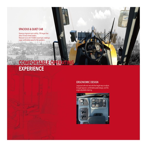 SPACIOUS & QUIET CAB: Generous legroom and visibility, 15% larger than other Chinese wheel loaders. Reduced noise with 78 dB(A) noise level, creating a super comfortable space for the operators.
