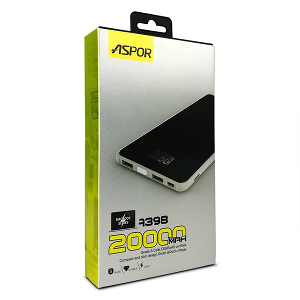 Powerbank Aspor A398, 20 000mAh, 2USB, with charging connector for MacBook. Filling the cans is 100% – which means you get exactly 20000 mAh declared by the manufacturer. Two USB connectors that can deliver up to 3 A., which greatly speeds up the time of your device. You can freely charge the tablet while on the road. There is a connector for charging the MacBook. The portable battery has a digital display, which allows you to monitor both the charging process of the Powerbank and the charge consumption. Also in the battery, there is a built-in LED flashlight. The battery case is made of impact-resistant plastic with Softouch coating.
