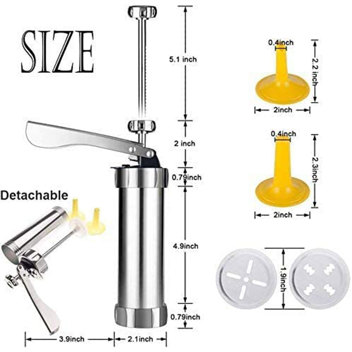 A cookie press is a device for making pressed cookies such as spritzed back. It consists of a cylinder with a plunger on one end, which is used to extrude cookie dough through a small hole at the other end. Typically the cookie press has interchangeable perforated plates with holes in different shapes, such as a star shape or a narrow slit to extrude the dough in ribbons. Have twenty types of biscuits and four nozzles for decorating cakes.