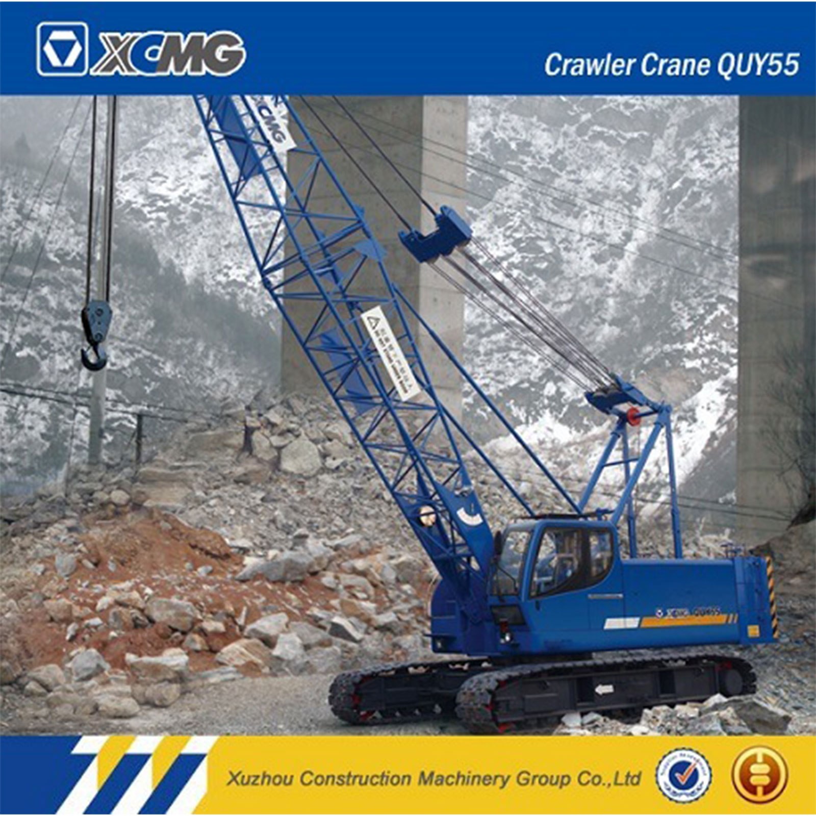 XCMG Crawler Crane(QUY55) is designed and developed independently in the absorption of foreign advanced technology and combined with China's domestic work conditions. It features a hydraulic drive, full swing, and lattice boom, and also the first adoption of pilot proportional control in China's domestic crawler cranes. This crane is easy operation, stable travel, and reasonable arrangement in structure. This crane is suitable for lifting and installation jobs in a construction site, mine, factory, and dockside. Optional mechanical grab is available for earthmoving and stacking work.