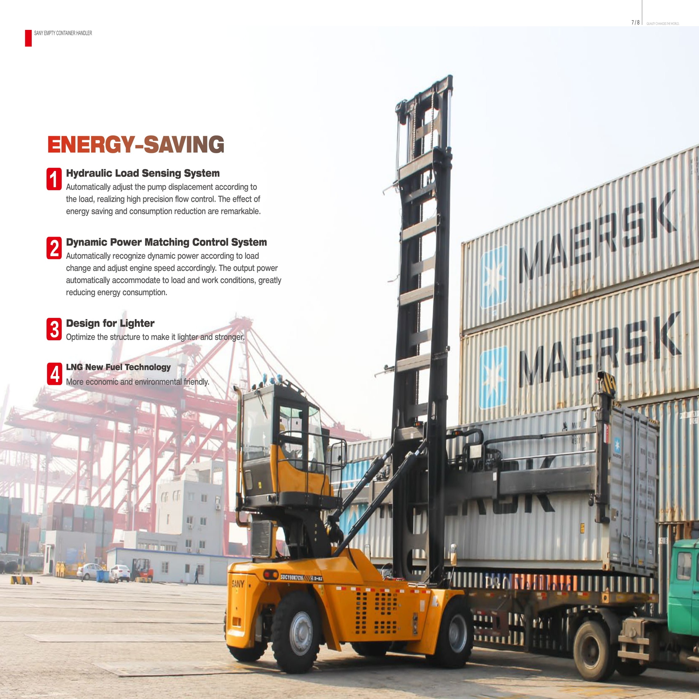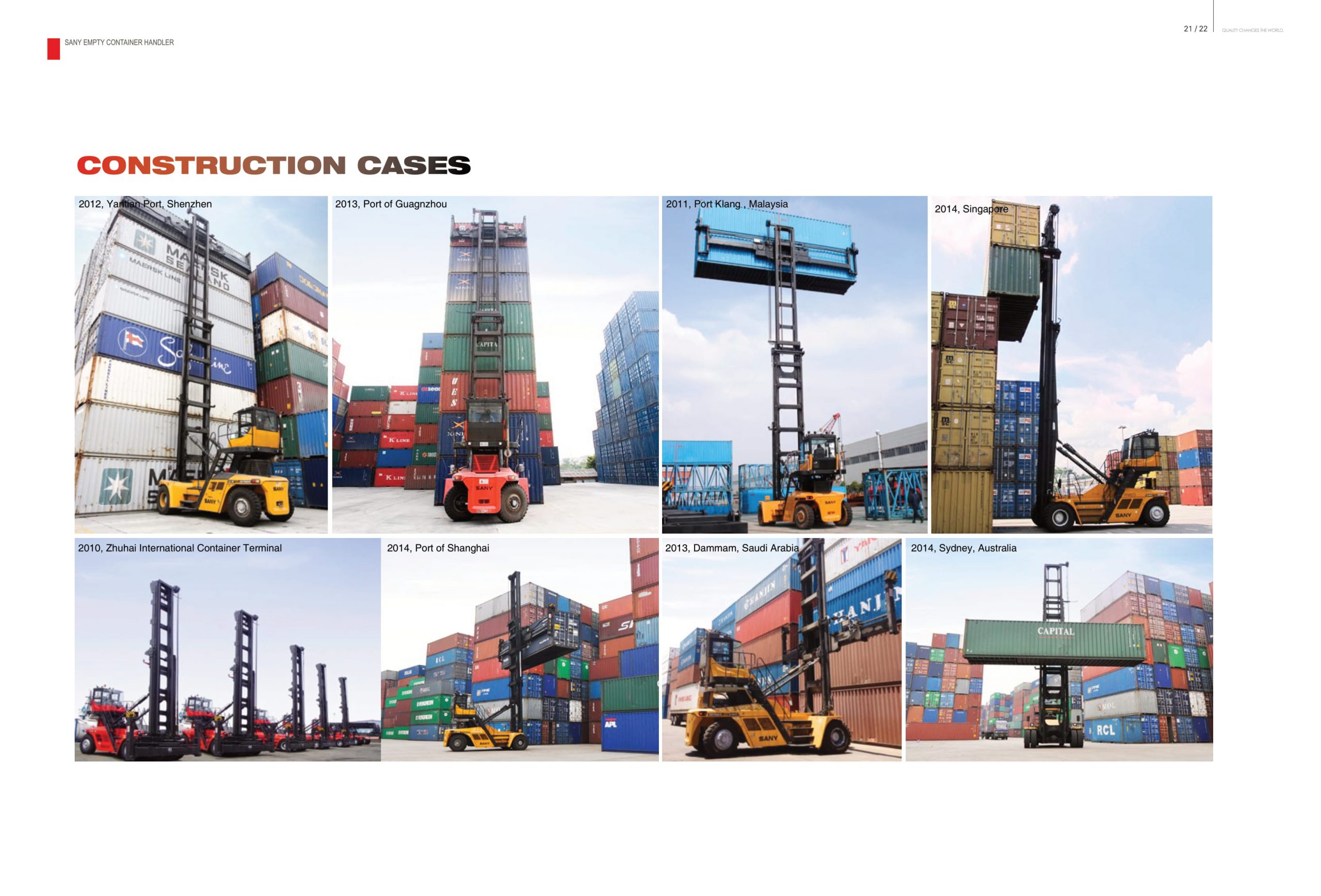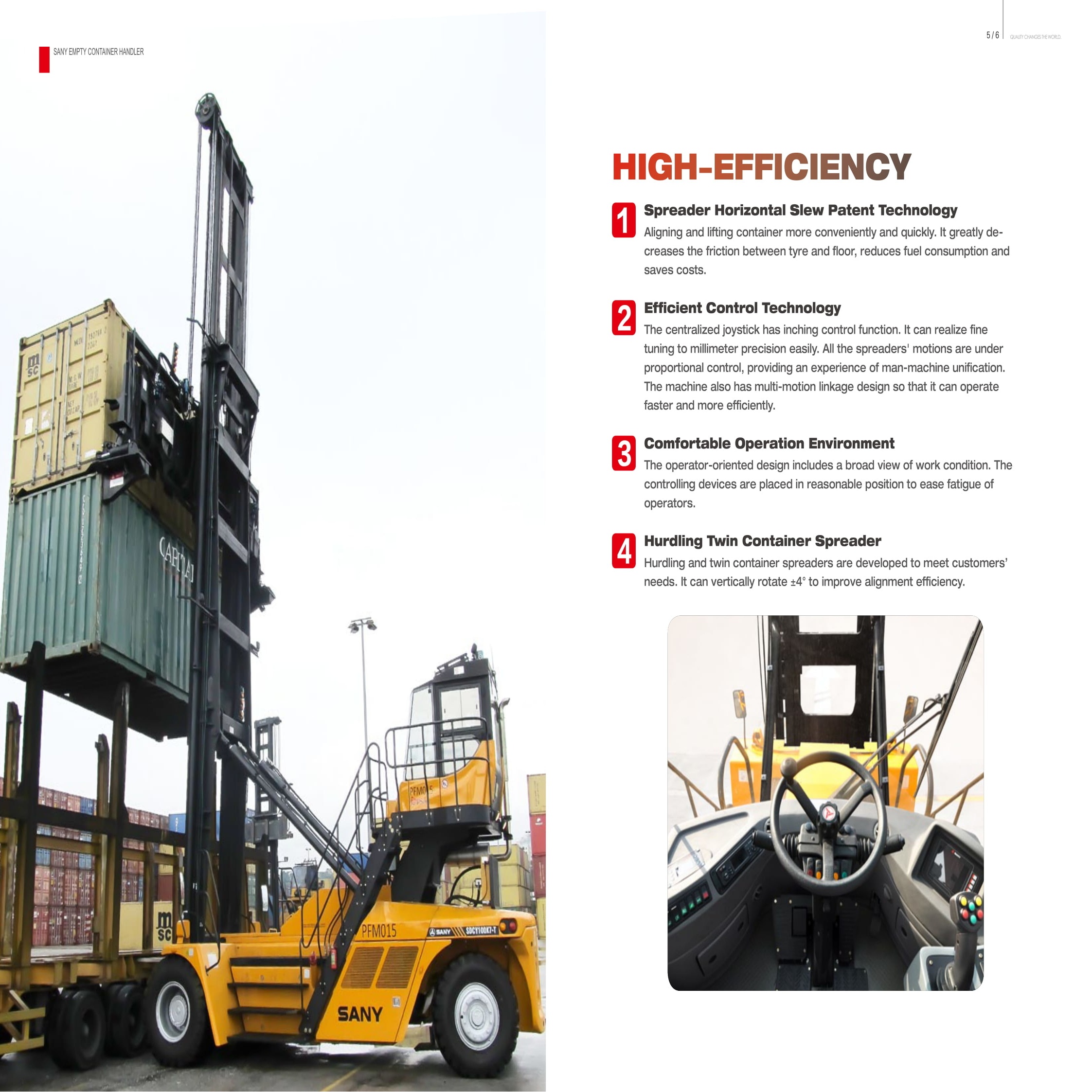 SANY empty container handler is a workhorse in the container yard. Constantly moving, maneuvering, lifting and setting. Productivity is the key to profitability, and the container handlers are engineered for grueling long shifts in all weather conditions. With expansive visibility and many cab comfort features, SANY empty container handlers are easy to operate for the most demanding workloads.