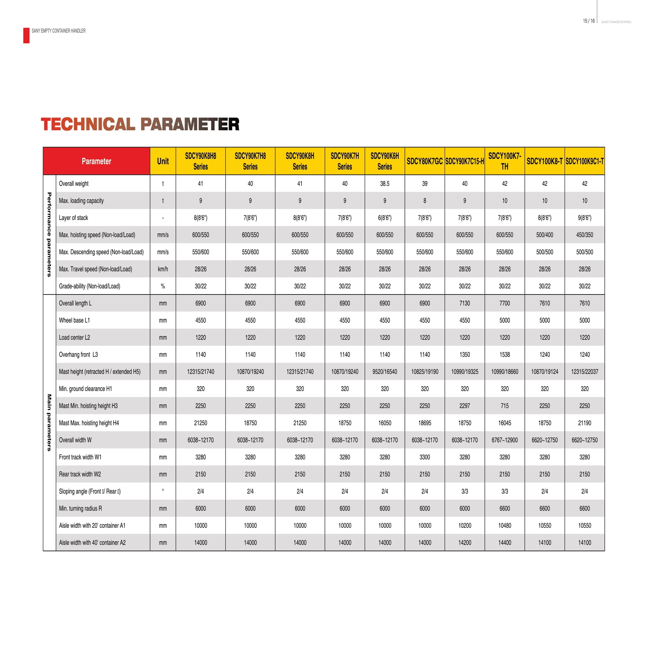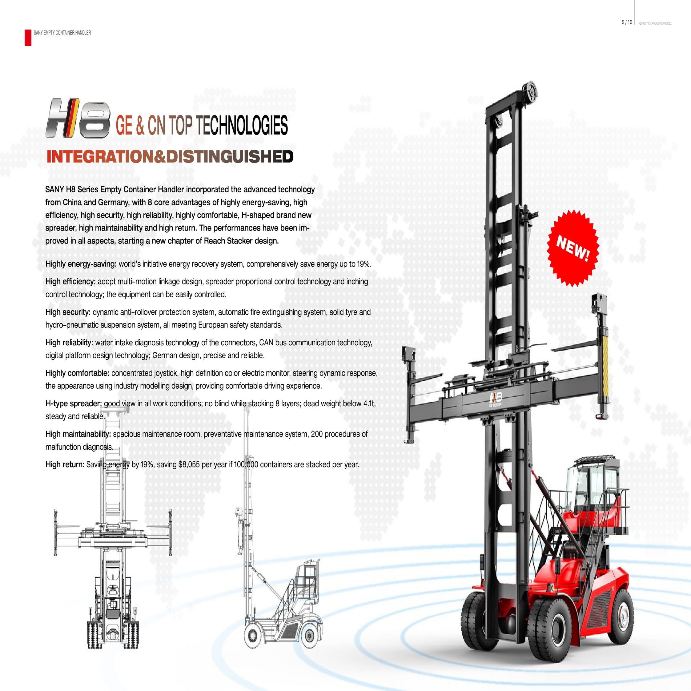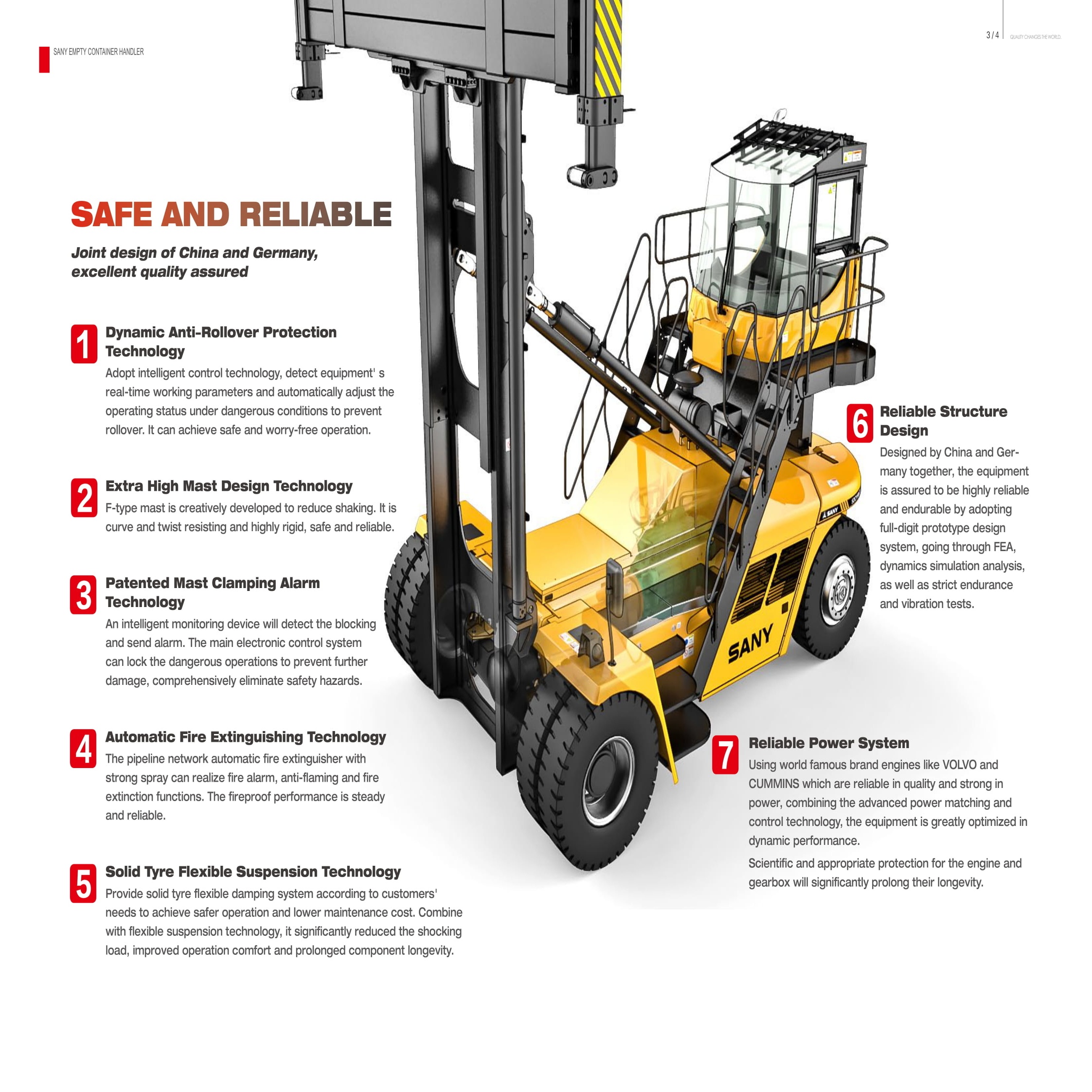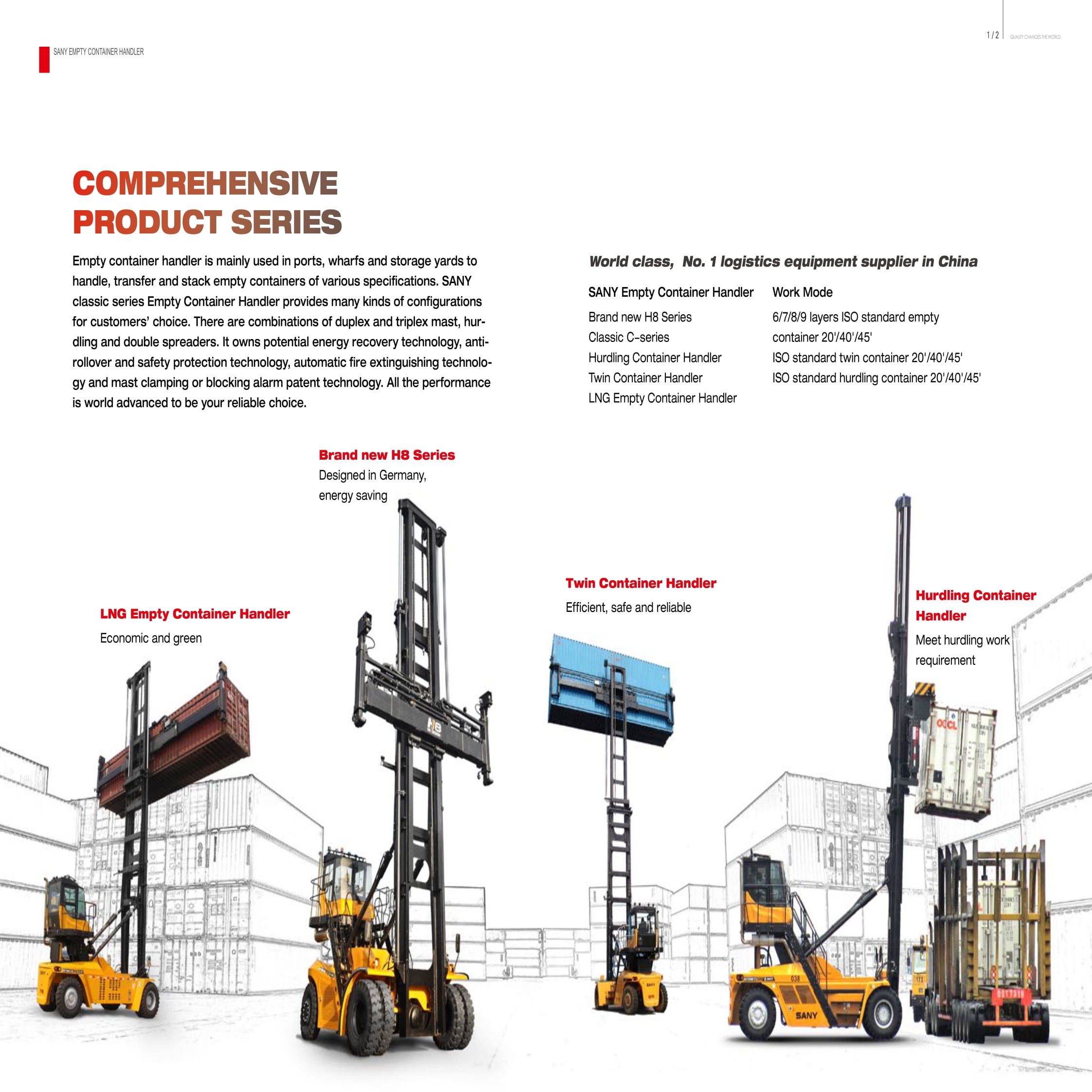 SANY empty container handler is a workhorse in the container yard. Constantly moving, maneuvering, lifting and setting. Productivity is the key to profitability, and the container handlers are engineered for grueling long shifts in all weather conditions. With expansive visibility and many cab comfort features, SANY empty container handlers are easy to operate for the most demanding workloads.