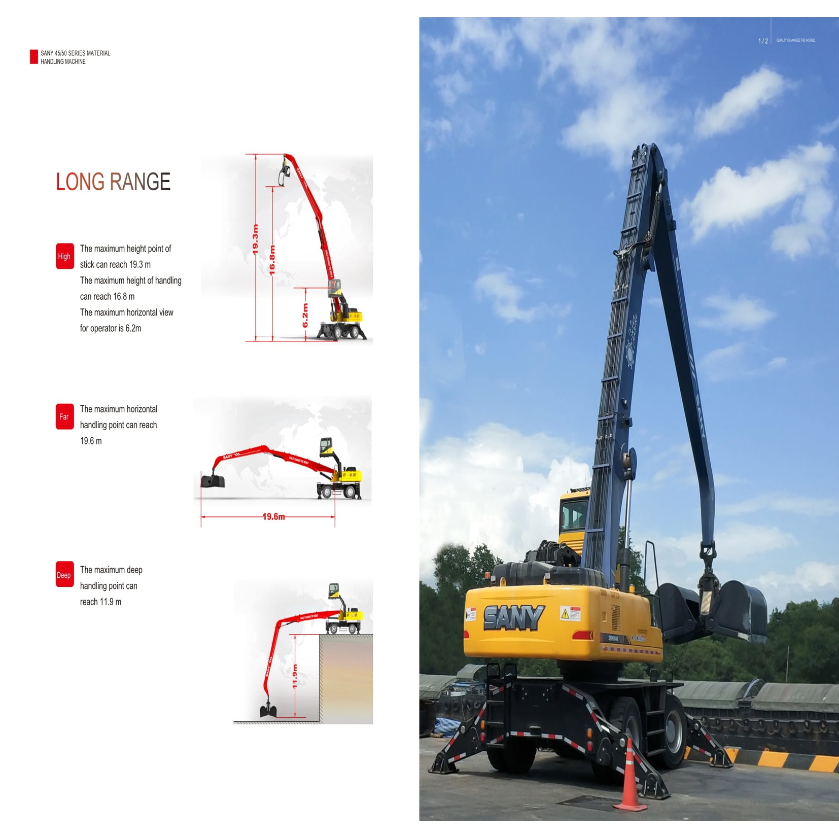 1. Height: The maximum height point of stick can reach 19.3 m. The maximum height of handling can reach 16.8 m. The maximum horizontal view for operator is 6.2m 2. Reach: The maximum horizontal handling point can reach 19.6 m 3. Depth: The maximum deep handling point can reach 11.9 m.