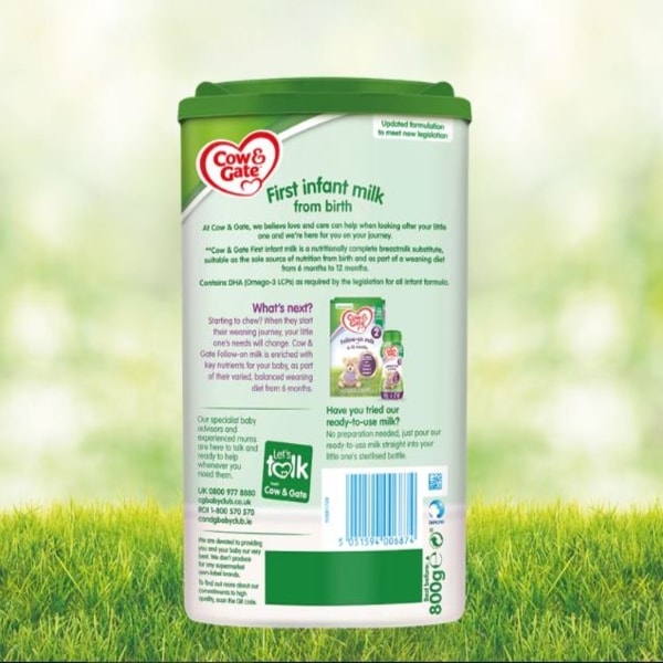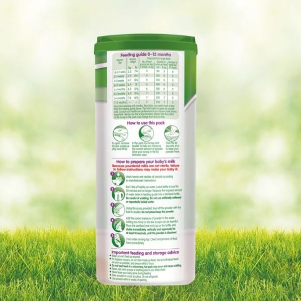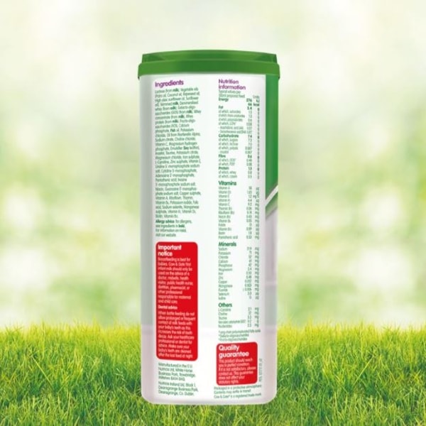 Lactose (from milk), Vegetable oils (Palm oil, Coconut oil, Rapeseed oil, High oleic sunflower oil, Sunflower oil), Skimmed milk, Demineralised whey (from milk), Galacto-oligosaccharides (GOS) (from milk), Whey concentrate (from milk), Whey protein (from milk), Fructo-oligosaccharides (FOS), Calcium phosphate, Fish oil, Potassium chloride, Oil from Mortierella Alpina, Sodium citrate, Choline chloride, Vitamin C, Magnesium hydrogen phosphate, Emulsifier (Soy lecithin), Inositol, Taurine, Potassium citrate, Magnesium chloride, Iron sulphate, L-Carnitine, Zinc sulphate, Vitamin E, Uridine 5'-monophosphate sodium salt, Cytidine 5'-monophosphate, Adenosine 5'-monophosphate, Pantothenic acid, Inosine 5'-monophosphate sodium salt, Niacin, Guanosine 5'-monophosphate sodium salt, Copper sulphate, Vitamin A, Riboflavin, Thiamin, Vitamin B6, Potassium iodide, Folic acid, Sodium selenite, Manganese sulphate, Vitamin K1, Vitamin D3, Biotin, Vitamin B12.