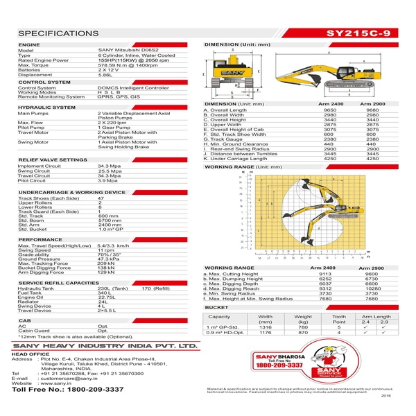 SY215C-9 is powered by powerful & fuel efficient Sany Mitsubishi D06S2 with exceptional power and work capacity without compromising on fuel economy. The 6 cylinders water-cooled diesel engine is equipped with a turbocharger to improve the overall efficiency of the engine.