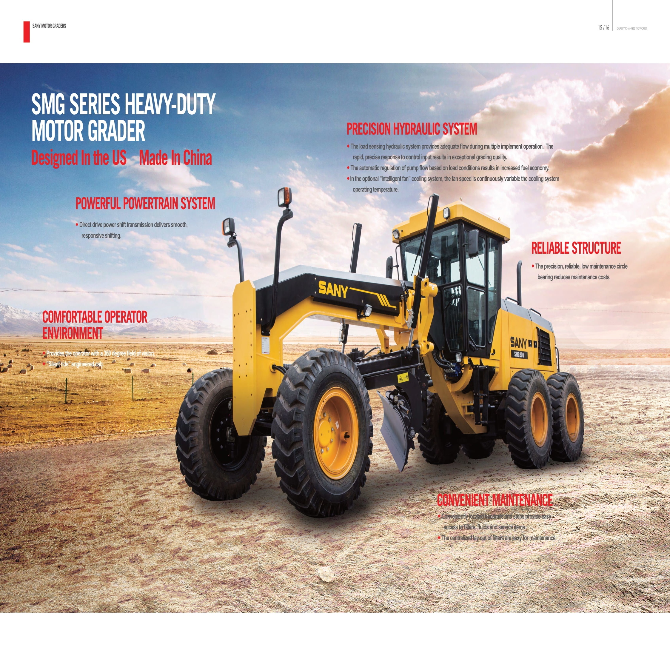 SANY motor grader features by ease of operation, strong power, reliable components and environment-friendly. SANY road graders adopts world's first hydraulic mechanical transmission system and intelligent control system, realizing precise hydraulic control and creating higher efficiency. The newly-designed structure and strengthened parts make the road grader easier to be maintained.