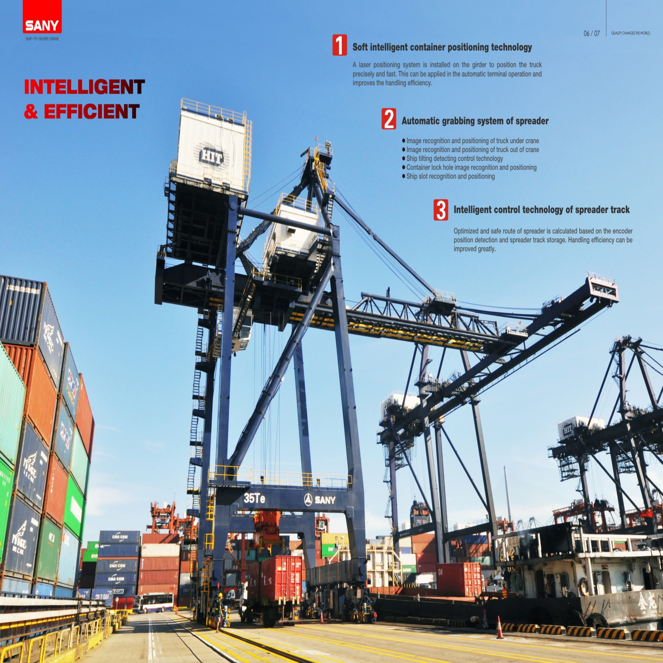 1. Multi-function slewing and anti-snag technology 2. Active rectifier technology applied for energy recycling 3. Intelligent control on spreader track improves efficiency and safety 4. High-speed traversing of trolley on the rails of girders 5. Soft and intelligent landing of containers onto the truck 6. Automatic positioning and locking of spreader 7. Malfunction automatic detection and real-time display of data on CMS interface
