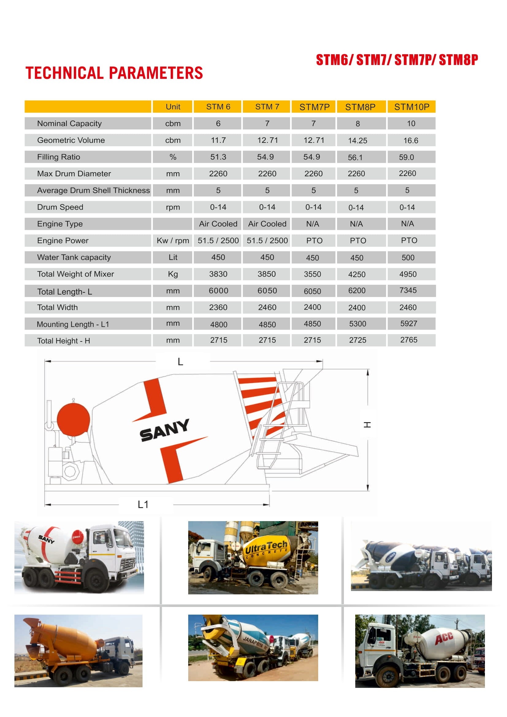 STM 7: Sany STM7 truck Mixer having normal capacity 7cbm, geometrical volume of 12.71. & fill ratio of 54.9 Sany Truck Mixer are highly durable& volumetric discharge system. The 7cbm truck mixer can adapt to varied harsh conditions and improves its service life.