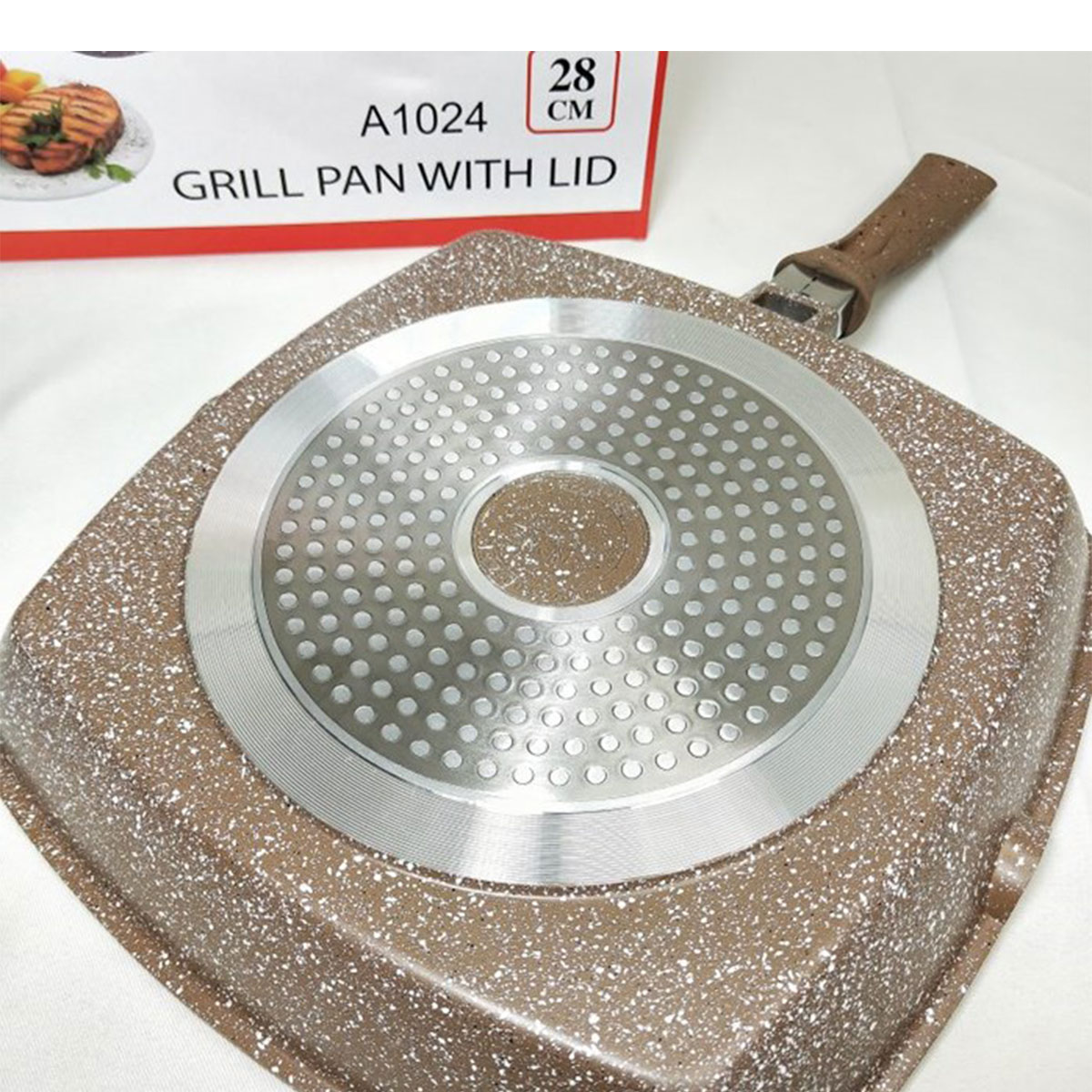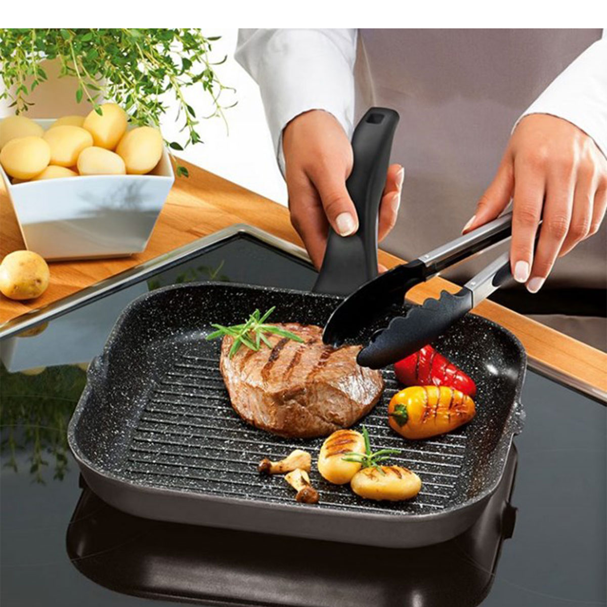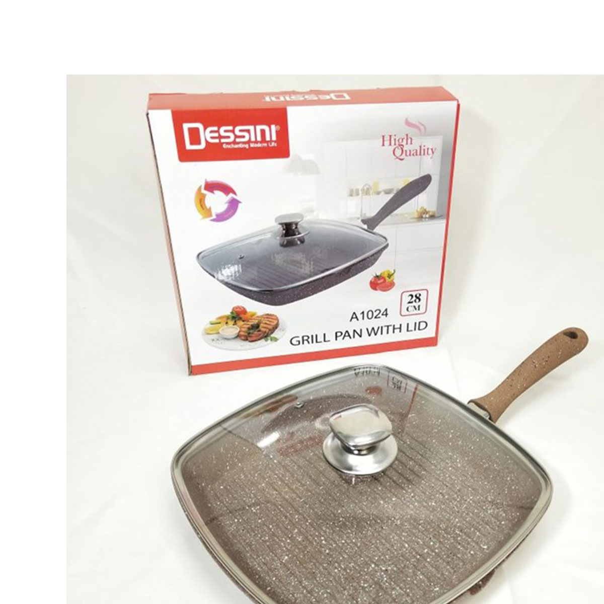 This latest new design double sided Dessini grill pan is must-have cookware for your kitchen, the double-sided pan with the silicon sealing on the edge and magnetic locking mechanism will create a pressure effect while cooking, locking in the heat and pressure to cook the food more quickly and evenly, therefore saving time and energy. The sealing will also prevent odor and smoke escaping from the pan while frying, it will also prevent oil splattering, making frying your favorite food cleaner and easier, the excess oil and water will flow out through the drip tray for easy cleaning. The ergonomic handle design and stainless steel handle holder will ensure safe and comfort handling while cooking.