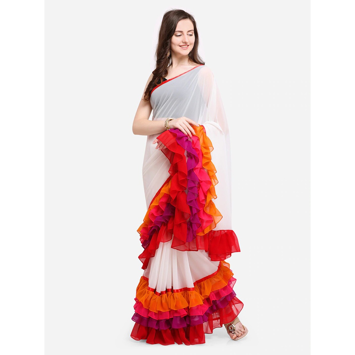 Indian Soft Weightless Georgette Saree (White & Red) With Matching Blouse Piece for Women