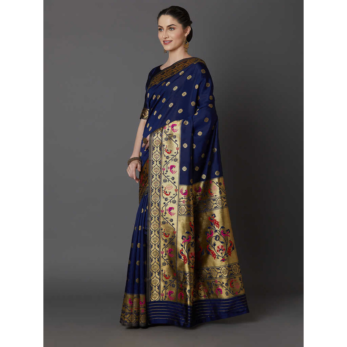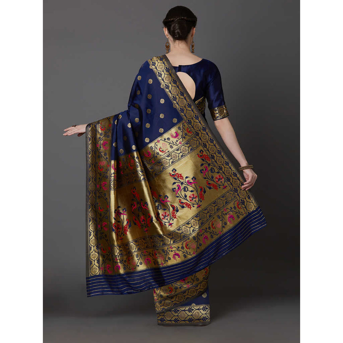 Latest Designed Luxury Exclusive Printed Katan Silk Saree (Blue and Gold) With Blouse Piece For Women