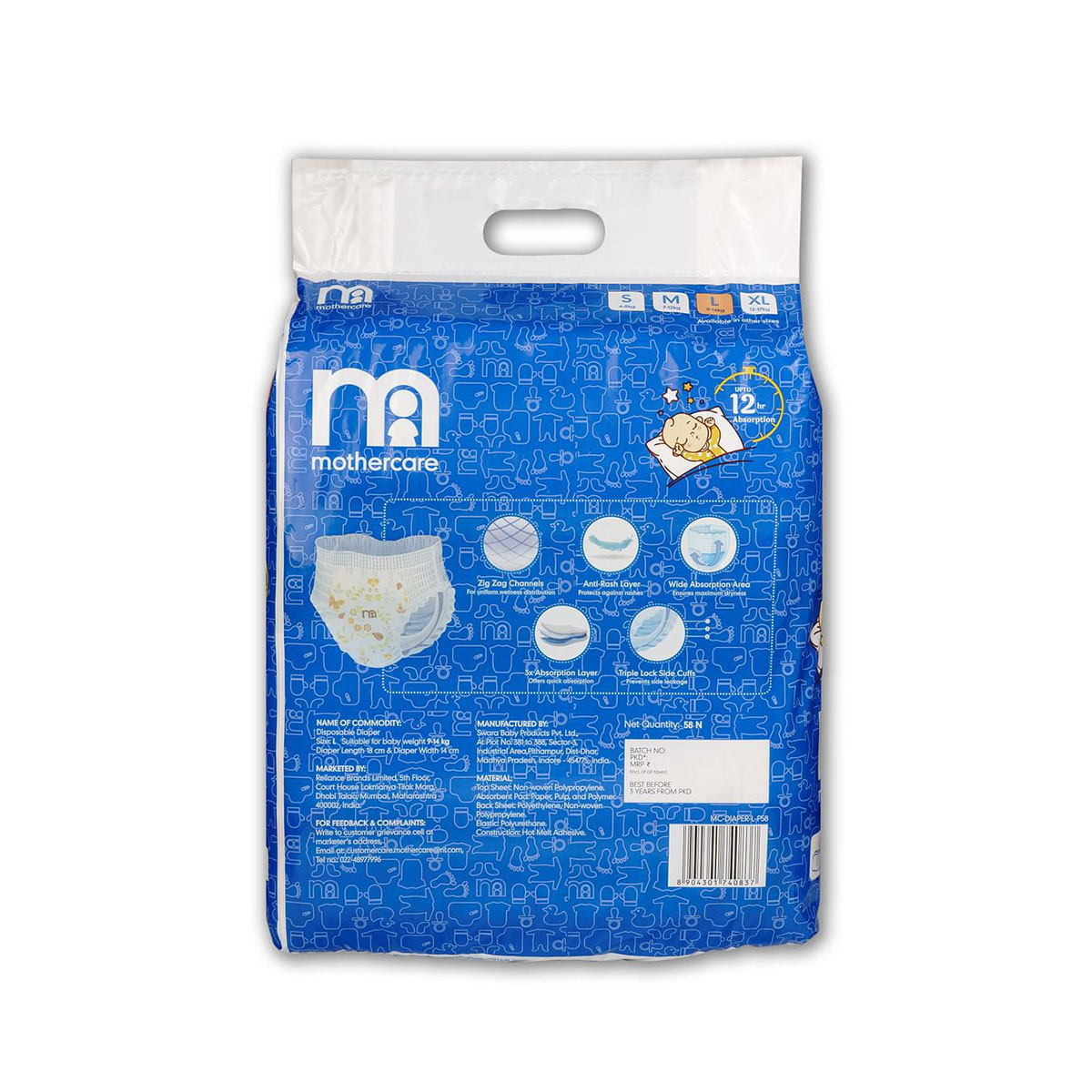 Baby deserves the best care! Mothercare Quick Absorb style diapers are designed with absorption layer & zig zag channels which helps in equal distribution of wetness & faster absorption. The anti-rash soft layer is gentle on baby’s skin keeping them irritation free & happy. Triple lock side cuffs locks the wetness & prevents leakage. Mothercare diaper provides up to 12* hours of absorption for comfy nights & happy mornings.