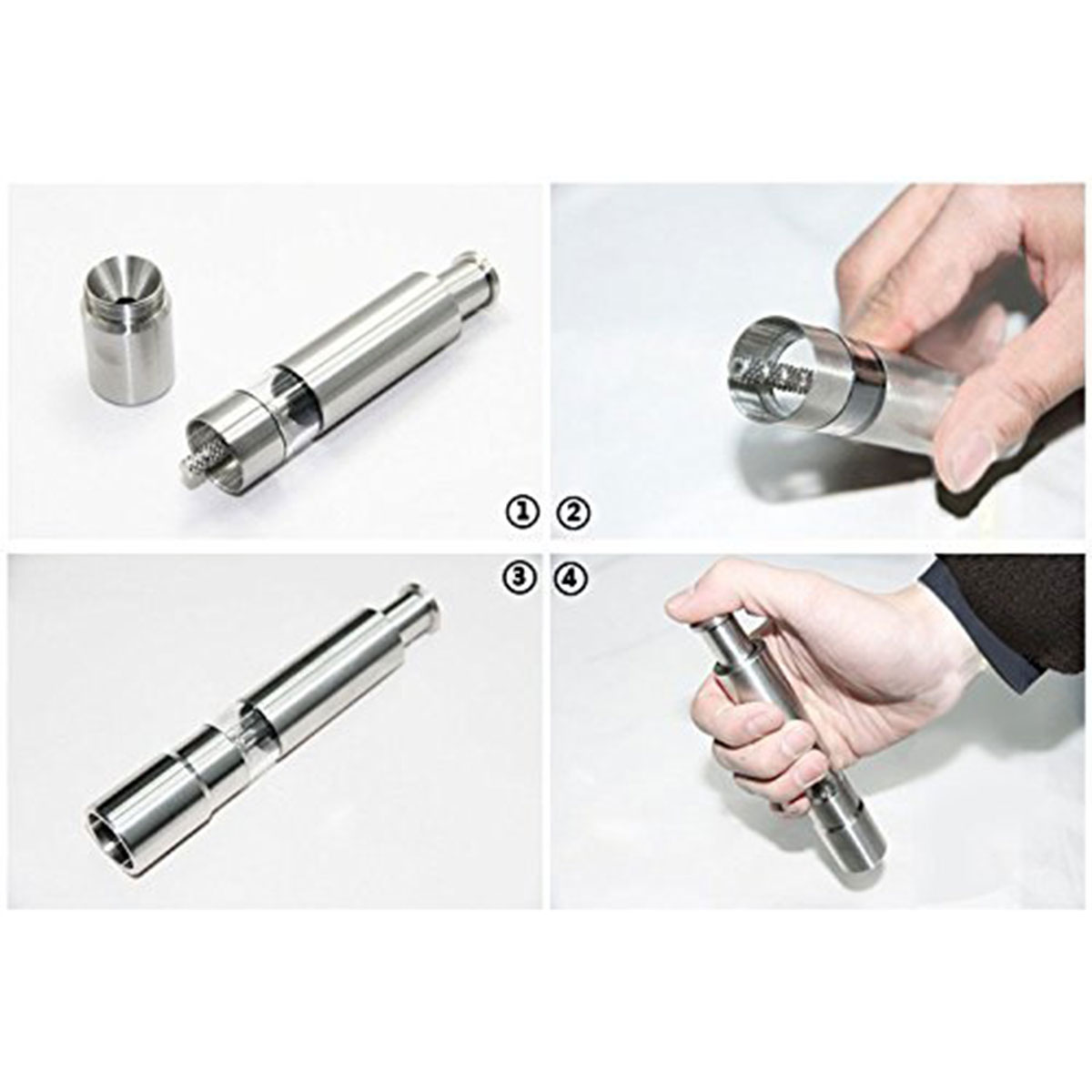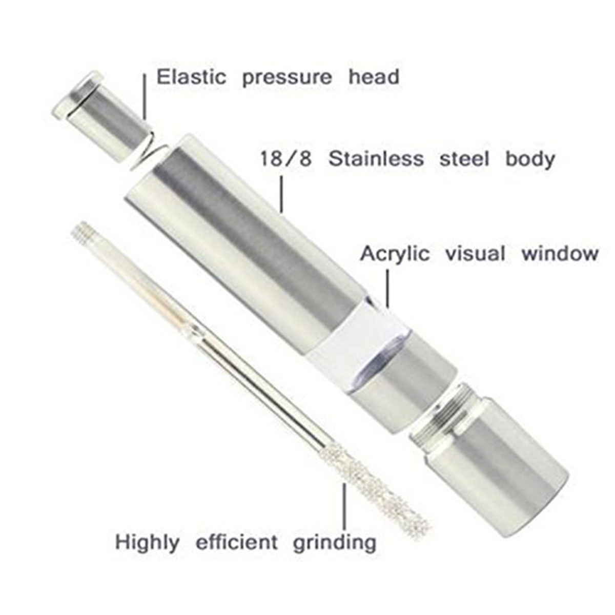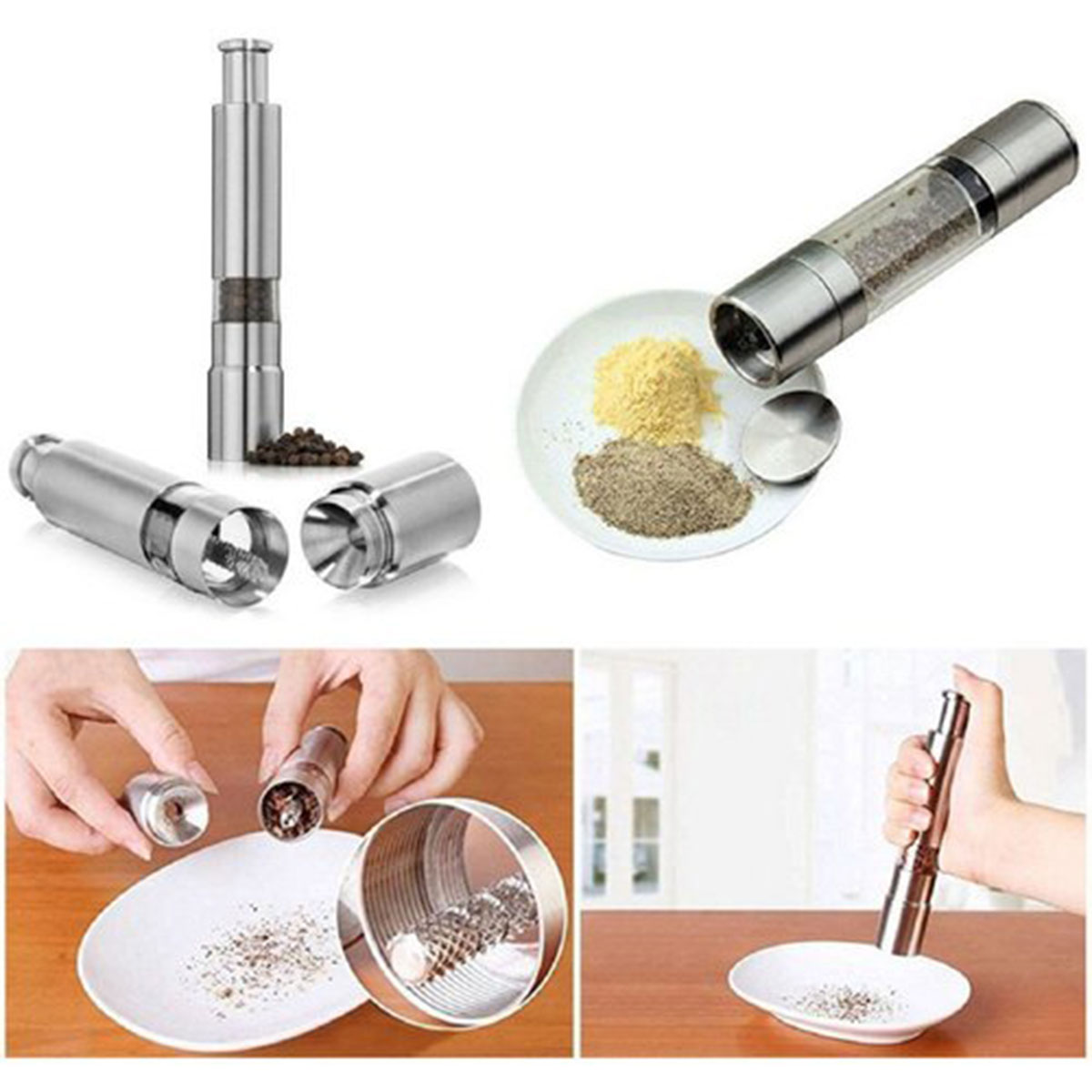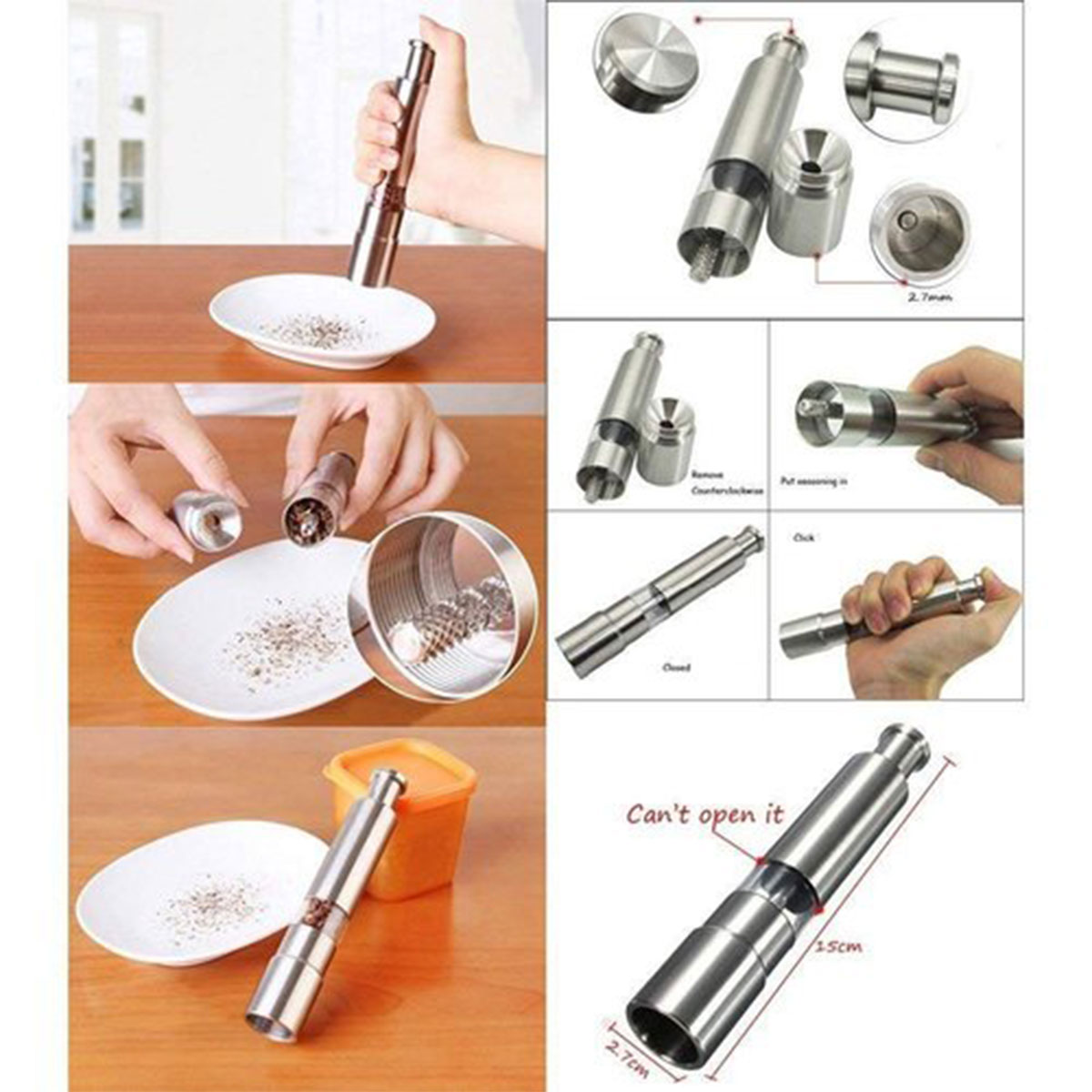 100% Brand new and high quality Innovative pepper mill dispenses spice with speed and ease Press the top to grind pepper in a simple, one-handed operation way Screw off the bottom for refilling Suitable for milling pepper, corn, mustard seed and other small sized spices Ideal gadget to make freshly ground pepper powder spice for enjoying a tasty salad or steak Size (H x Dia.): Approx. 6 x 1 inch / 15 x 2.7 cm Material: Stainless steel Color: Silvery Included: 1 x Pepper Grinder.