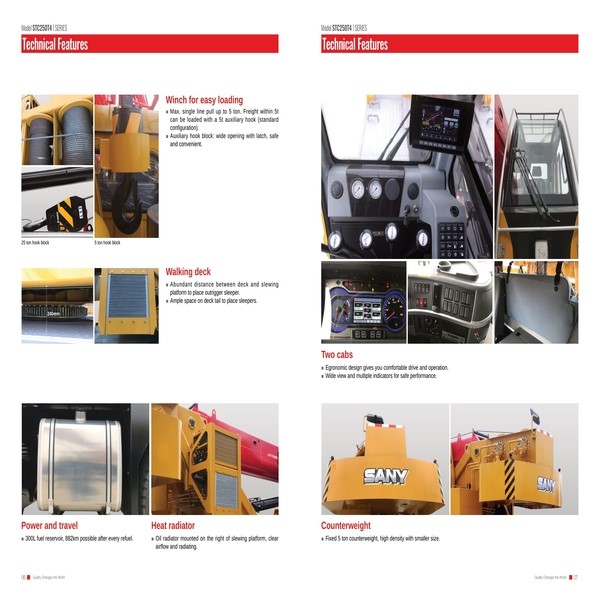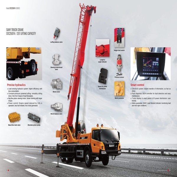 SANY truck crane features by high stability, driving flexibility, high lifting performance, simple structure and high efficiency with maximum lifting capacity ranging from 25t to 160t. The adjustable hydraulic system and intelligent electric control system make the truck cranes in high efficiency and low fuel consumptions.