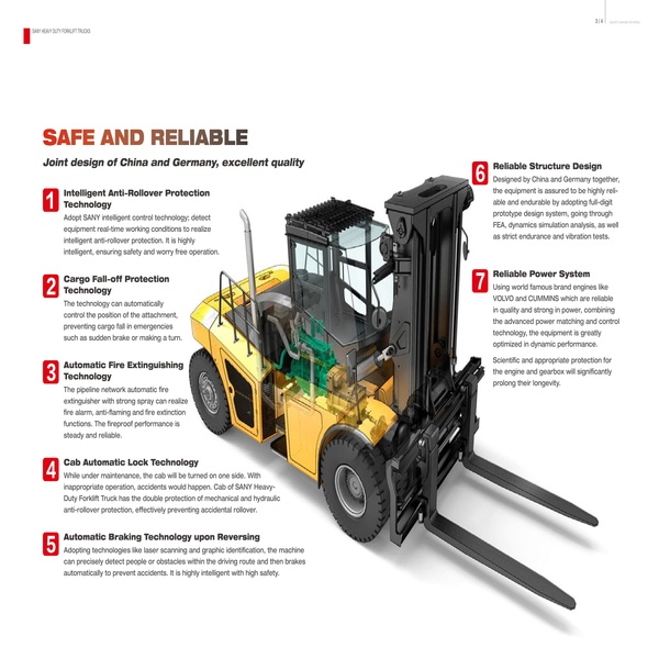 SANY forklift truck can not only handle large-tonnage cargo, but also support maintenance, discharge and installation of important equipment. With special attachments, it can handle steel, stone, concrete, wood, 20’ container, etc. the forklift is reliable and highly efficient with hoisting capacity from 10 to 46 tons. Various attachments and masts are provided to meet your different requirements.