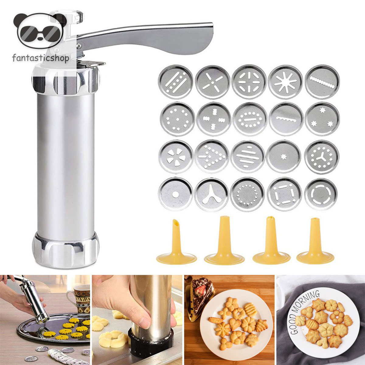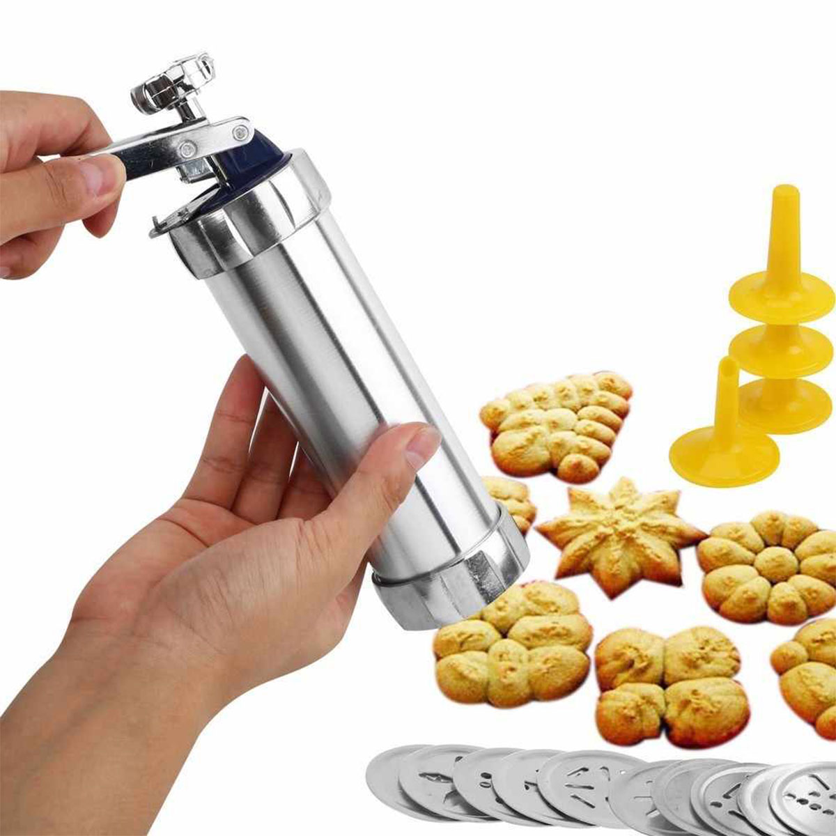 A cookie press is a device for making pressed cookies such as spritzed back. It consists of a cylinder with a plunger on one end, which is used to extrude cookie dough through a small hole at the other end. Typically the cookie press has interchangeable perforated plates with holes in different shapes, such as a star shape or a narrow slit to extrude the dough in ribbons. Have twenty types of biscuits and four nozzles for decorating cakes.